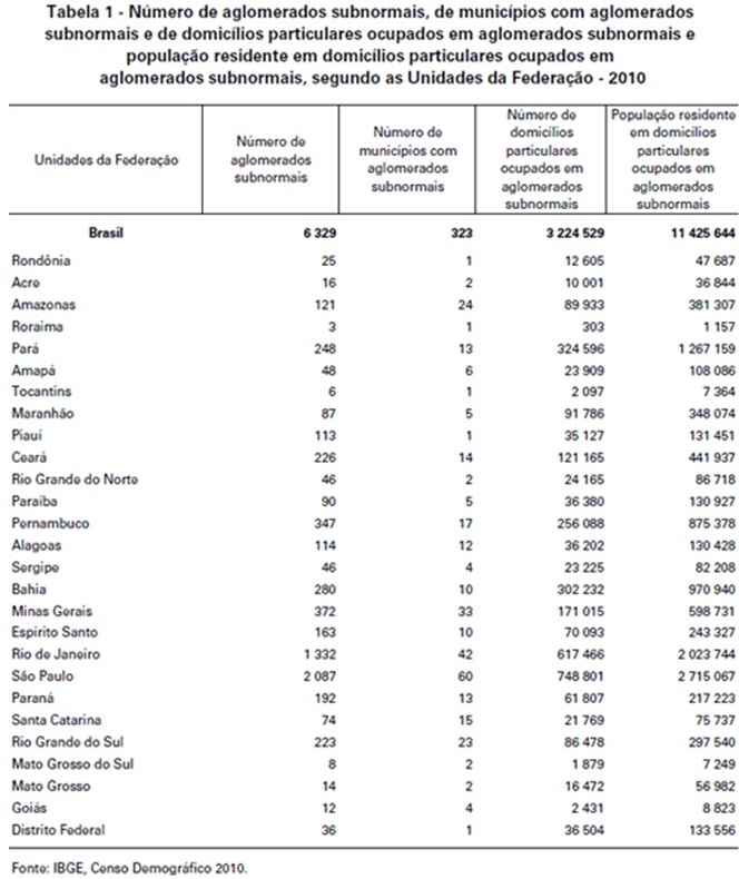 Dados coletados pelo governo federal revelam que boa parte da população do Brasil vive em condições precárias de habitação. Em 2010 o Censo registrou que o país possuía 6.329 aglomerados subnormais (assentamentos irregulares conhecidos como favelas, invasões, grotas, baixadas, comunidades, vilas, ressacas, mocambos, palafitas, entre outros) em 323 dos 5.565 municípios brasileiros. Nestas áreas, segundo a pesquisa, estavam instaladas 11.425.644 pessoas, o correspondente a 6% da população brasileira. Estas encontravam-se em 3.224.529 domicílios. Ainda de acordo com o Censo este tipo de moradia é encontrado com frequência em encostas no Rio de Janeiro, áreas de praia em Fortaleza, vales profundos em Maceió (localmente conhecidos como grotas), baixadas permanentemente inundadas em Macapá, manguezais em Cubatão, igarapés e encostas em Manaus. Do total destas moradias 49,8% estão na Região Sudeste, conforme mostra a (Tabela 1).